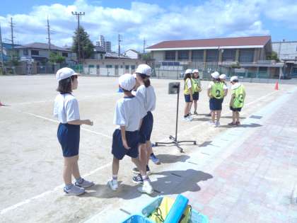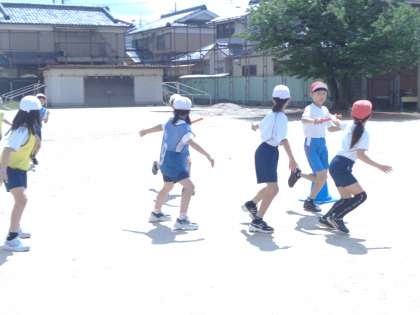 とてもいい天気の中で「リレー」の学習をしました。バトンパスの確認やリードの仕方,走順などをグループで話し合って確認していました。