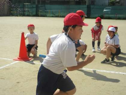 運動場のトラックをつかって、実際に走りました。自分のチームのために一生懸命走っている姿は、かっこよかったです。