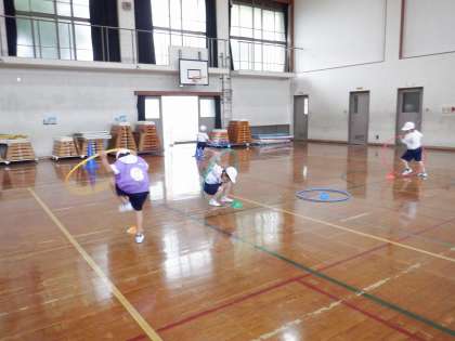 体育でリレーあそびをしました。コーンまで走って行って折り返すリレーと、途中でフラフープをくぐるリレーをしました。次に走る人が、線を越えないように待っていたり、同じチームの友達を最後まで応援したりする姿が素敵でした。
