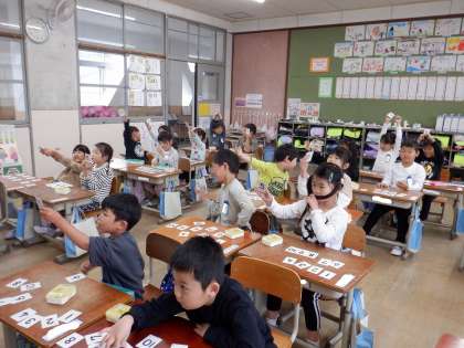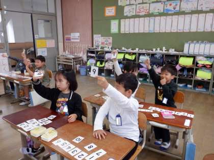 どちらのクラスも、タンバリンの音が鳴った数を聞きとるゲームと、大きさ比べのゲームが人気です。