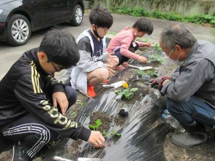 管理用務員の稲垣さんに教えてもらいながら、畑に野菜の苗を植えました。