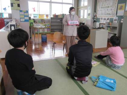 図書館の使い方や、貸出期間についてのお話の後、「こだぬきのこいのぼり」という絵本の読み聞かせをしていただきました。