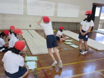 立ち幅跳びでは、しっかり膝を曲げて腕を振って勢いをつけ、力一杯前へ跳ぶことができていました。