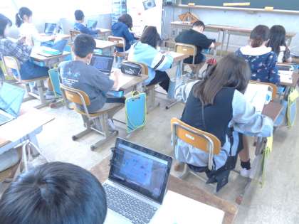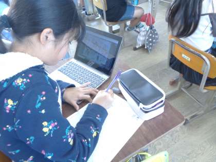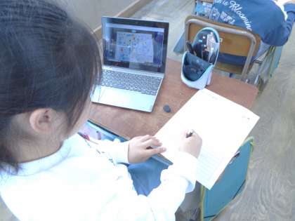 「絵の具でゆめもよう」の鑑賞をしています。みんなの作品をじつくりとみるためにGIGA端末に入れた写真を拡大しながら、素敵な工夫を見つけました。
