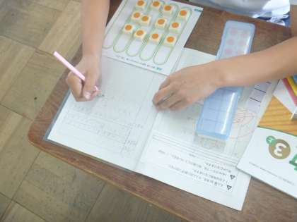 立式をし、数図ブロックを使って確かめました。一人に3こずつしっかりと分けることができていました!