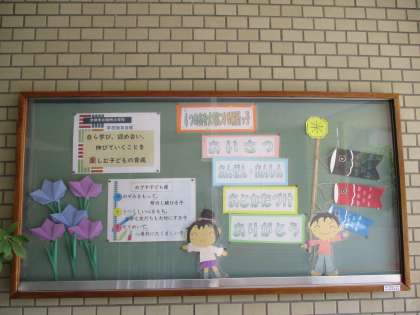 職員玄関の掲示板に学校教育目標と「4つのあ」を掲示しています。
