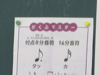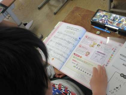 音楽の学習では、教科書の楽譜を見て、付点8分音府、16分音符などの音符を確認して書きました。難しい音符でしたが、丁寧に書くことができました。