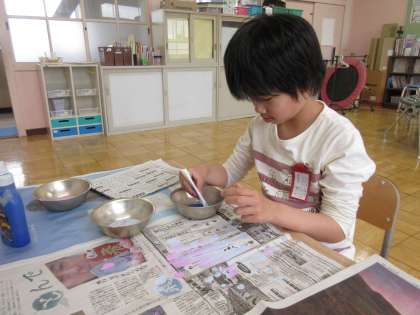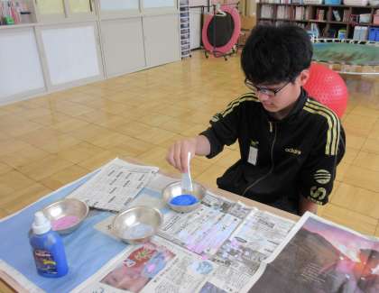 先月、コーヒーフィルターに模様を描いたり、絵の具で染めたりして鯉のぼりの鱗を作った3組の子どもたち。今月もまたコーヒーフィルターの登場です。