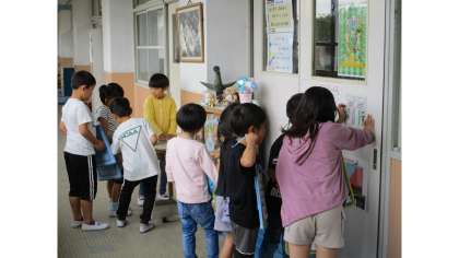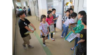 今日は、2年生と一緒に学校探検をしました。2年生がとてもやさしく、いろいろな部屋を案内してくれていました。探検した部屋に行くとシールをはることができます。全部の部屋をまわって、シールを全部はることが出来て、1年生はとてもうれしそうでした。