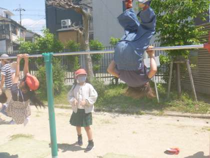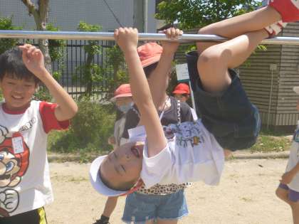 休み時間は、おにごっこをしたり、ドッチボールをしたり・・・今日は、鉄棒をしていました!