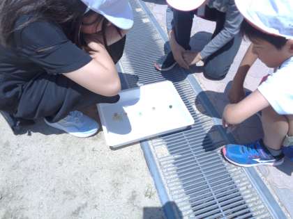 「水の流れと地面の傾き」地面の傾きと水の流れる方向を調べています。水をビー玉に置き換えて試しました。実際に確かめたことで「水が高いところから低いところへ流れる」ことをまとめていました。身の回りの排水溝のお風呂や台所の使った水の流れる仕組みにも気が付けました。