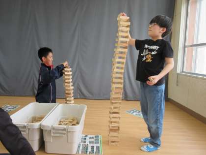 3組の子どもたちが、手慣れた手つきでパパっと積み上げたり並べたりしていく様子に、中学生も驚いていました。