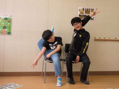 片付けを終えて、教室へ戻る前に、椅子に座って決めポーズ!?をしていました。
