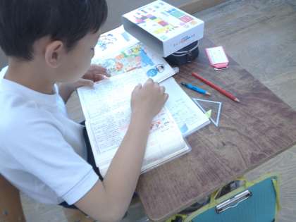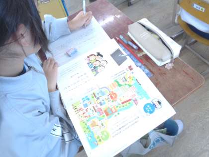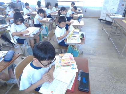 「漢字の広場」今回は,教科書の挿絵の住人になったつもりで指定された漢字を使いながら短文を書きました。文の長さや漢字の意味を考えながら作っています。意味が不安な時は、進んで国語辞典を引いていました。