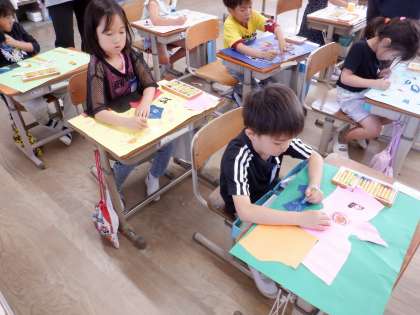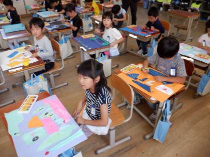 やぶいた紙が何かに見えてきたので、クレヨンでつけたして、絵に表しました。いろいろな思いつきをどんどん描いて楽しみました。