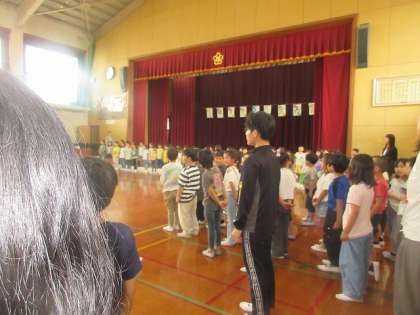 いよいよ1年生を迎える会が始まりました。まずは、あたたかい気持ちで1年生を迎えました。みんなの拍手があたたかく感じました。1年生もうれしかったと思います。全校のみんなで、「はじめの一歩」を歌いました。