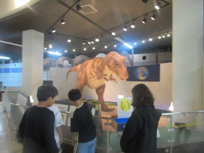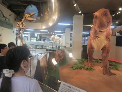 展示学習でも、たくさんのことを学べました。まずは、肉食恐竜のティラノサウルスの展示を見て、興味をもって学んでいる様子がありました。