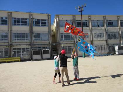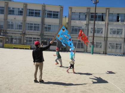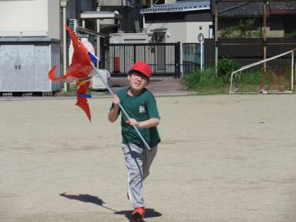 みんなで作った「鯉のぼり」を、棒に貼り付けて、運動場で泳がせてみました。