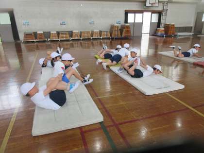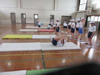 「マット運動」マット運動は、6年間を通じて学習する単元です。去年の自分を思い出して、めあてを決めて取り組みます。マット運動に必要な準備運動も意識して取り入れています。
