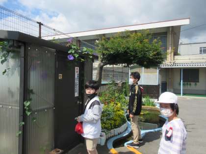 管理用務員の稲垣さんに、「琉球アサガオと言って、とても強くてどんどん増えるアサガオなんだよ。種ではなく、根で増えるんです。」と教えていただきました。