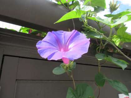 池の近くの小屋に、もうアサガオらしきものが咲いているのを発見!!