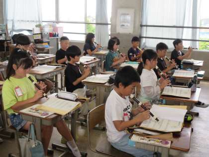 リコーダーの練習をしています。はじめて,「シの♭」を教えてもらい、きれいな音出しにチャレンジしています。