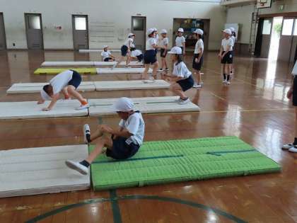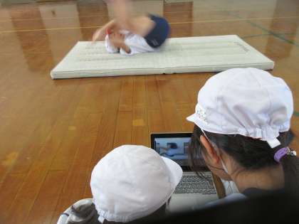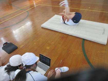 マット運動の学習を頑張っています。今回は、自分のフォームを確認するためにペアの友達と動画にとって確認しました。「自分では、膝を伸ばしているつもりなのに思ったより曲がっていたから、もっと伸ばさないと。」「掌でしっかりとマットを押したらきれいに回れそう。」など客観的に自分を見ることで気づくことがありました。