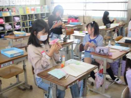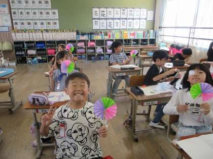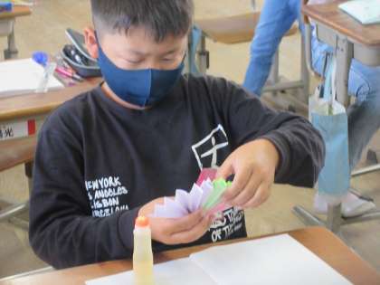 算数の「角とその大きさ」の学習では、折り紙を使った丸く開く扇のようなものを作りました。その扇のようなもので90度や180度、360度などを目で見て確認しました。