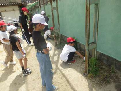 5月30日(木)の2時間目に、たてわりのグループで、学校の周辺の草抜きをしました。子どもたちは、暑い中一生懸命、草抜きや石拾いをがんばりました。