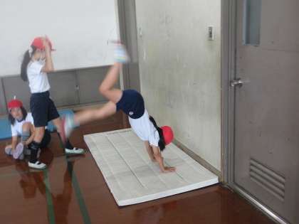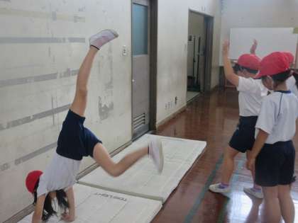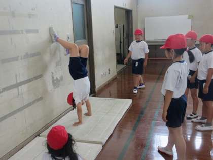 体育のマット運動では、さまざまな技に挑戦しています。壁倒立では、肘を曲げないこと、顔はマットに向けることなど、友達といろいろな意見を出し合い、取り組むことができていました。
