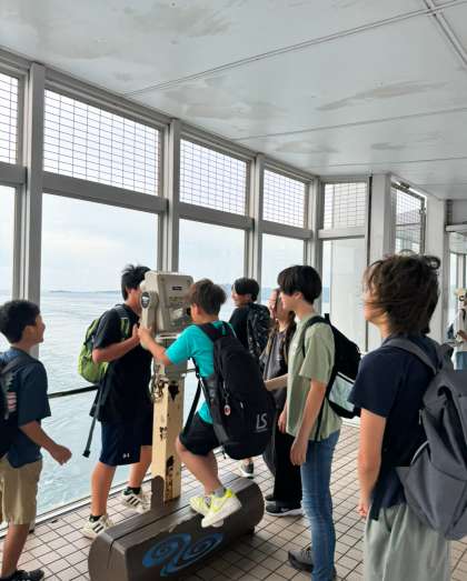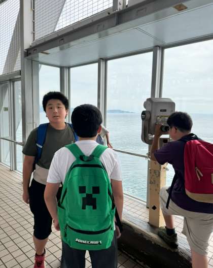 展望室からは瀬戸内海の雄大な景色を眺められます。広い海の向こうに見える島や、大小様々な渦を見つけて楽しんでいました。今日はたくさん渦が見られる絶好の日だったようです。