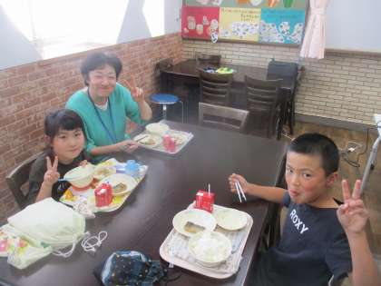 給食は、みんなで1階にあるランチルームでおいしくいただきました。食べ物の働きを知ると、食べ方も変わりますね。