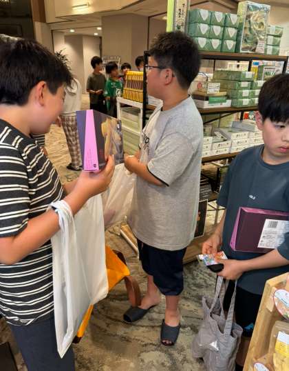 お土産タイムです。家族のことを考えて一生懸命に選んでいます。どれも気持ちのこもったお土産です。お楽しみに。