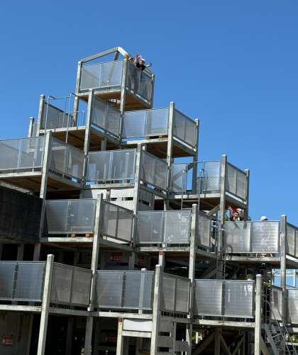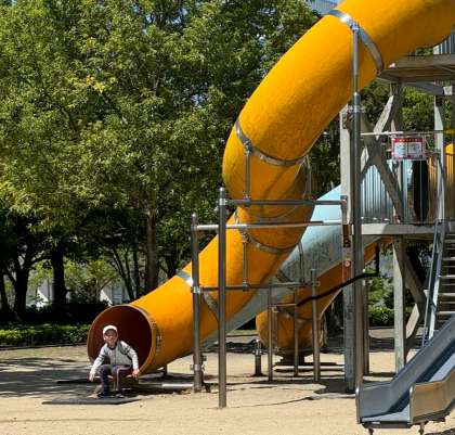 あすたむらんどの冒険の国でアスレチックを楽しんでいます。グループ毎に行動しています。