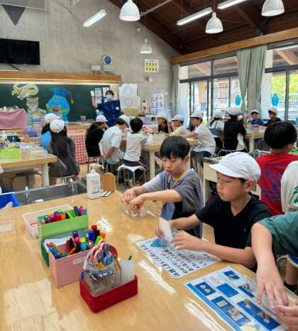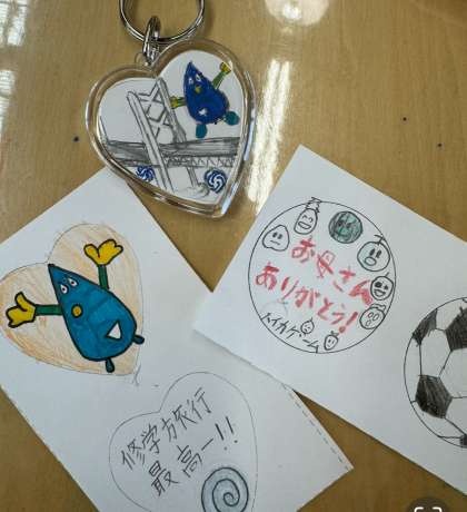 体験工房でキーホルダー作りをしています。思い出を絵や言葉に表しました。