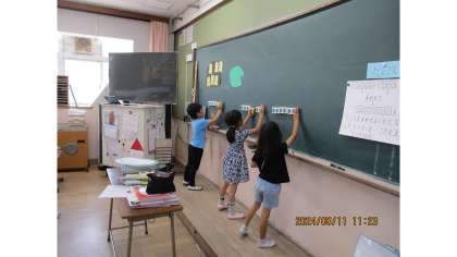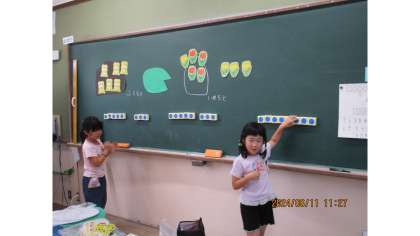 今まで学習してきた「あわせていくつ」と今日学習した「ふえるといくつ」のブロック操作の違いや〇図の表し方の違いについて、学習をしました。「あわせて」と同じように最後には一緒になるので、どちらもたし算になることを確認しました。