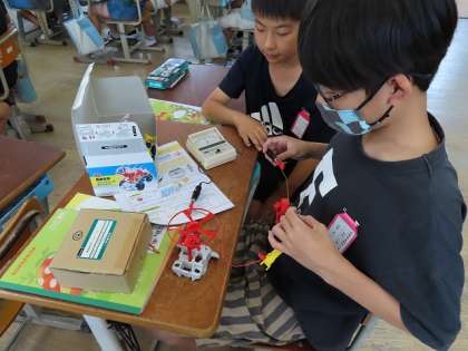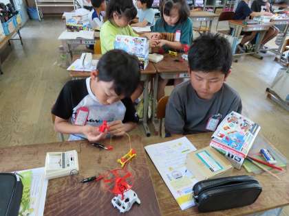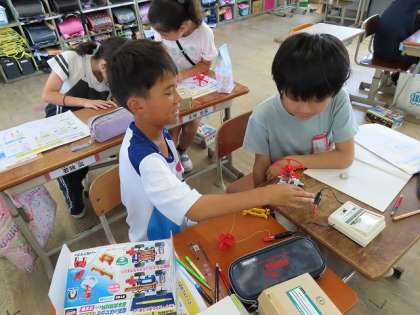 「電気のはたらき」乾電池をつなぐ向きとモーターの回る向きの関係を調べるために、簡易検流計を使って回路をつくっています。