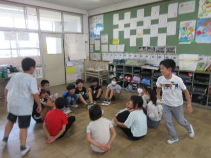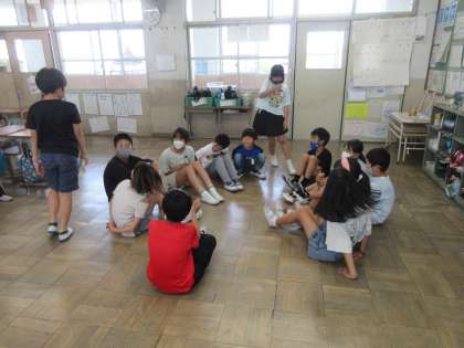 休み時間に全員あそびをしました。今回は、ハンカチ落としです。みんなドキドキしながら座って待っていました。