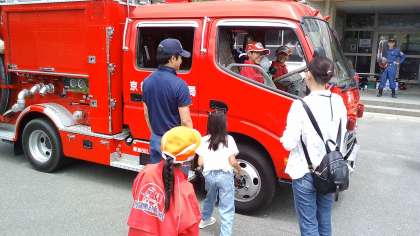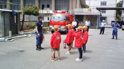 入団式の後は、消火器の使い方を教わったり、消防車を近くで見せてもらったりしました。今後たくさんの活動を通して、人々の安全を守ることについて学んでいってくれることだと思います。皆さん頑張ってくださいね!