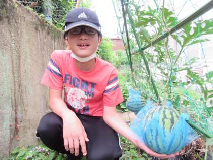 「やっぱり今日持って帰りたい。」とまた言っている子もいましたが、これは大玉スイカ。まだまだ我慢です。管理用務員さんが、カラス除けの柵を作ってくださったので、これで大丈夫かな!?