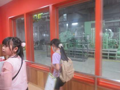 蒸気の力で発電機のタービンを回して電気を作る、蒸気タービン発電機を見ることができました。タービンが回る時にキーンという音が鳴っていました。また、中央制御室では、施設の技術者の方が施設の中やごみピットなどを点検している様子を見ることができました。