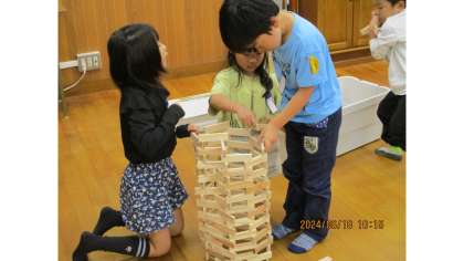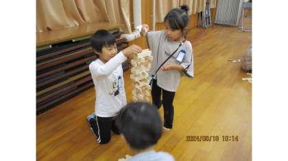 今日の中間休みは、からから積み木を使って遊びました。グループの友達と協力して、出来るだけ高く積むための工夫を考えながら、楽しんで遊んでいました。