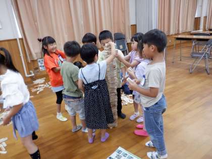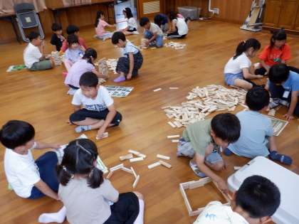 どちらのクラスでも、からから積み木は大盛り上がりでした。高く積む以外にも、形をつくったり、別の物に見立てたりできました。崩れる時は気持ちのいい音で、手でも耳でも楽しみました。