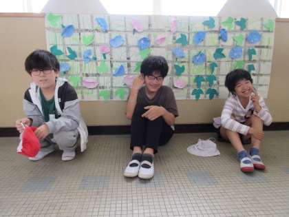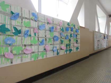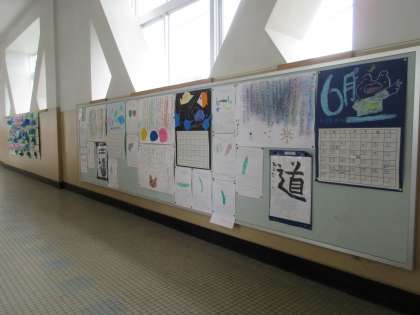 3組の教室前廊下に、子どもたちの作品をたくさん掲示しています。