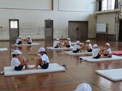 「すもう遊び」しっかりと準備体操をした後、いろいろな相撲遊びの活動をしました。初めはお互いが体育すわりをして両手で押し合う「すわり相撲」やしゃがんだ状態で押し合う「しゃがみ相撲」からはじめました。
