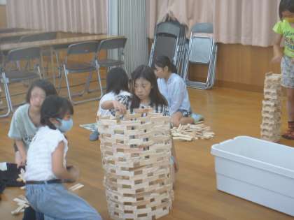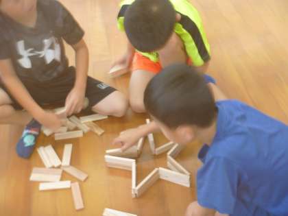 積み上げた作品のほかにも、床に置いて形をつくるグループもありました。星の形にチャレンジしていました!