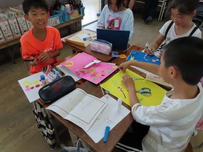 「カードで思いを伝えよう」渡したい相手のことを考えながらカードの飛び出す仕組みに何を貼ろうか、どんなメッセージにするかを考えながら作っています。少しずつ形になってきてとても嬉しそうです。