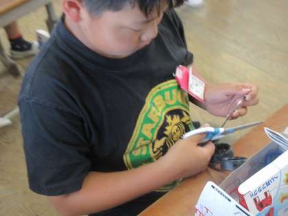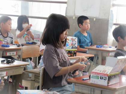 電気の力で動く車の部品を作りました。子どもたちは、早く車を動かしたくてうずうずしています。