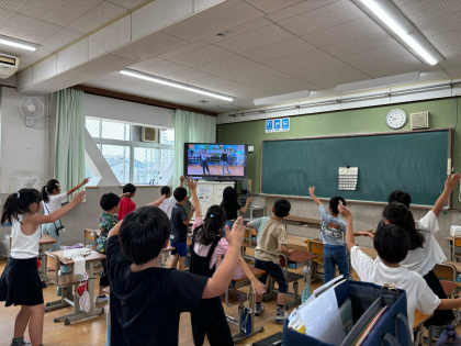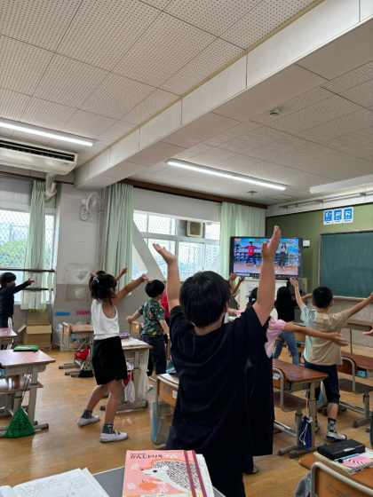 週明けの今日も、朝の会で音楽に乗り体を動かしています!