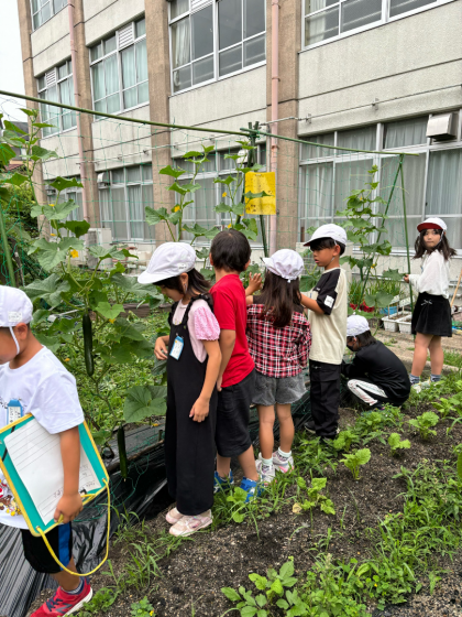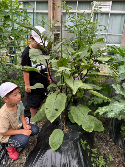 畑で育てているナスとキュウリの観察をしました。どちらも大きく育ち、その大きさに驚きや感動の声がたくさん聞こえてきました。
